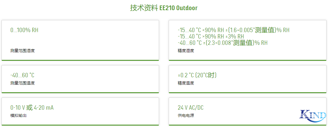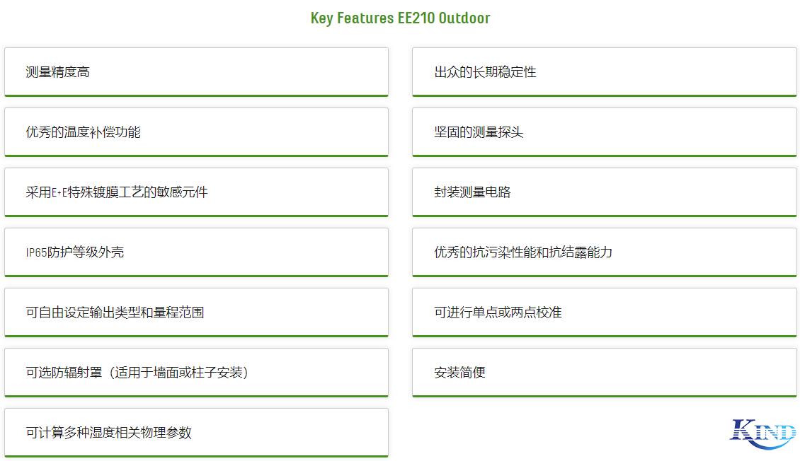 E+E EE210 Outdoor户外和气象用温湿度变送器EE210户外系列是一款适用于户外和气象应用的温湿度变送器。除了能精密测量相对湿度和温度以外,EE210还可以计算输出露点、霜点、热焓等其它相关参数。